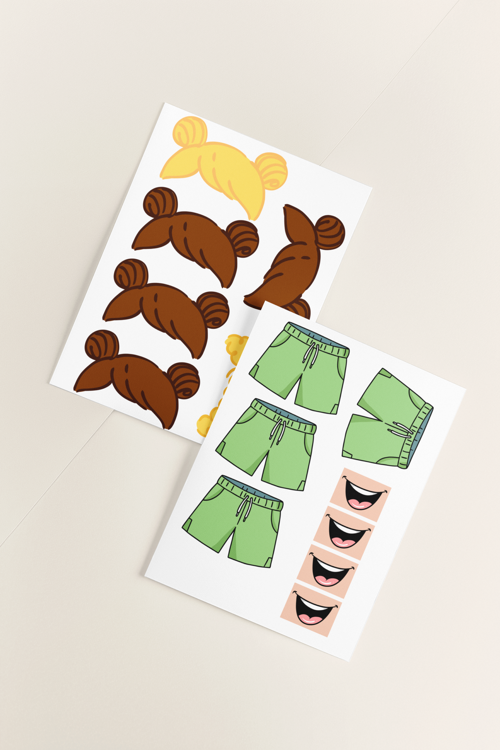 Cette activité contient 10 fiches différentes de jeu. L’enfant choisit une carte et lance le dé : la face sur laquelle le dé tombe correspond à l’élément que l’enfant doit prendre et placer sur la fiche du corps.