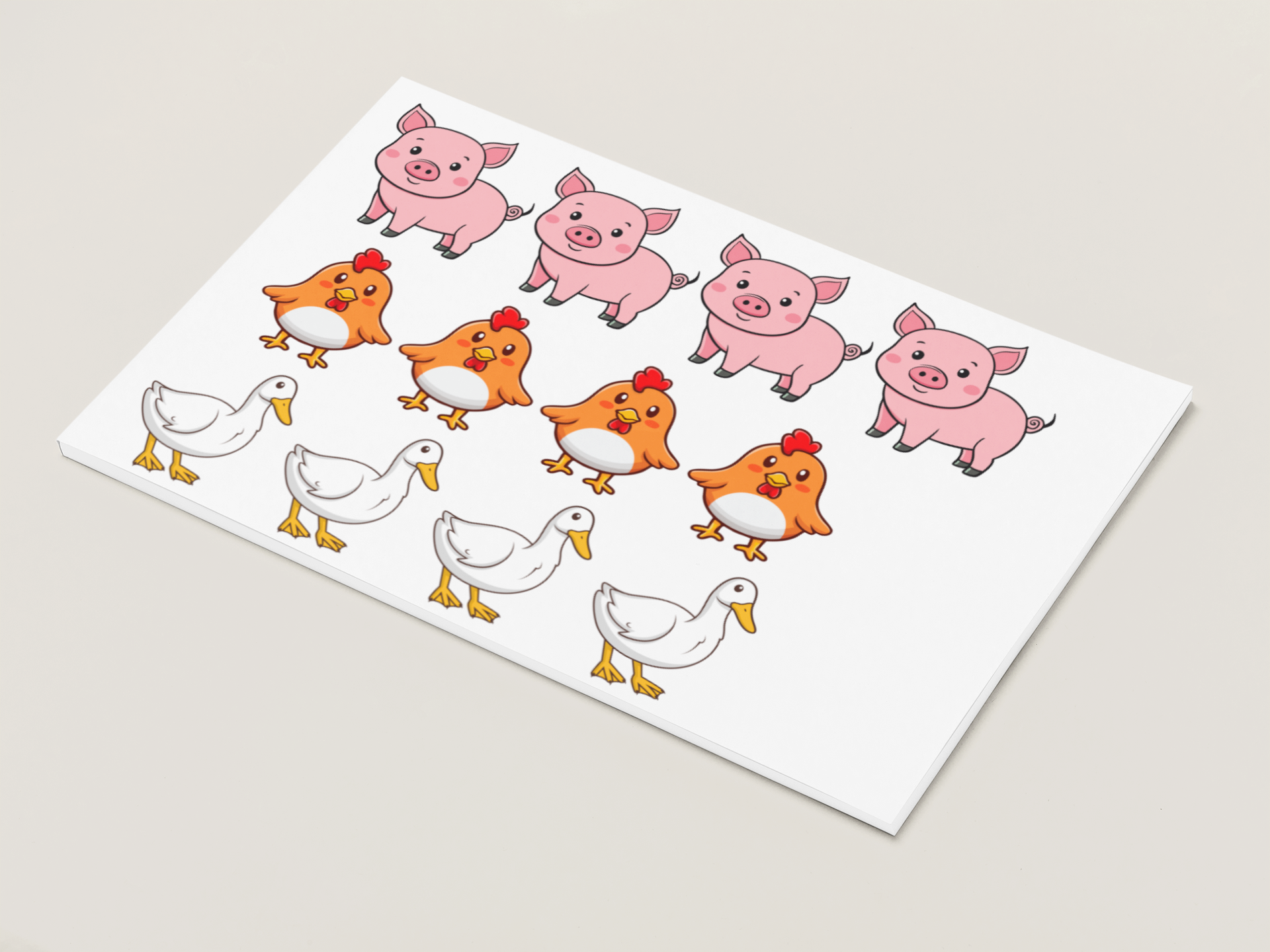 Le document contient également 4 grandes fiches vierges (avec uniquement le décor, sans animaux), et 4x chaque animal (pour que l’activité puisse être mise en atelier de 4 enfants). L’enfant prend une grande fiche vierge, choisit une carte à reproduire et place les animaux au bon endroit par rapport à cette carte, lorsqu’il a terminé une carte, il retire les animaux et peut recommencer avec une autre carte modèle 😉